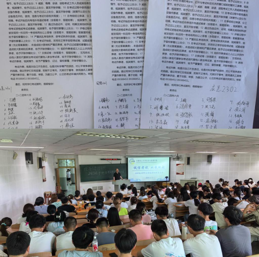 同时,李书记要求大家要重视学习,科学备考,诚实考试,做自律自爱,文明规范的学生。最后,2023级辅导员王怀老师对期末复习阶段的学习和安全问题加以阐述并组织学生签订诚信考试承诺书。