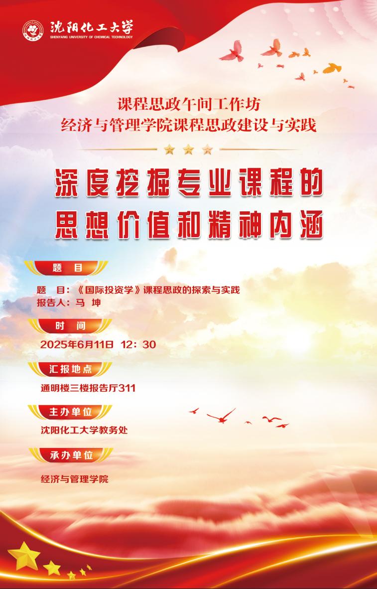 2025年6月11日,由bat365中文官方网站承办的第五期课程思政午间工作坊在通明楼会议报告厅311室举行。本次工作坊的主讲人为国际经济与贸易教研室马坤老师。她在领会分析教育部《高等学校课程思政建设指导纲要》等重要文件精神的基础上,深入思考课程思政在高校专业课教学中协同育人、隐性教育管理和差异化融入等方面的特征属性和作用,结合《国际投资学》课程的授课实践探索经济与管理类专业课程思政的实施路径和实际效果,总结拓展课程思政的深度、广度和温度的创新方法,最后对于未来如何结合第二课堂、社会实践以及人工智能技术提升课程思政的水平提出自己的见解。