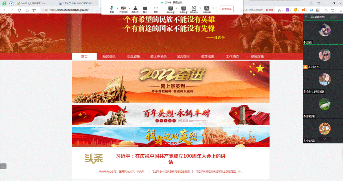 通过访问中华英烈网,带领支部党员了解烈士纪念设施地图,重点访问了辽宁省国家级和省级重点烈士纪念设施。党支部书记刘伟老师为全体党员详细介绍了抗美援朝烈士陵园、辽沈战役烈士陵园、雷锋纪念馆等爱国主义教育基地,叮嘱青年学生要铭记革命先烈的英雄事迹,弘扬爱国主义精神,多到爱国主义教育基地进行参观学习,为自己进行精神洗礼。