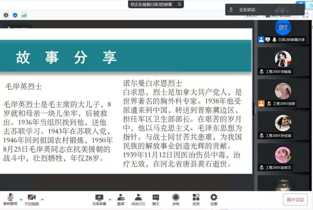 为深入传承弘扬英烈事迹和精神,引导广大青年学生传承弘扬革命先烈的优秀品质,引领崇尚、缅怀、学习、捍卫英烈的风尚,bat365中文官方网站分团委积极组织全体本科生、研究生团支部开展“传承英烈精神 赓续红色血脉”主题活动,通过线上开展主题演讲、研讨交流、故事分享会等形式,诵英雄诗、读历史事,引导同学们铭记革命先烈光荣事迹,感受今日幸福来之不易,坚定听党话、跟党走的决心。