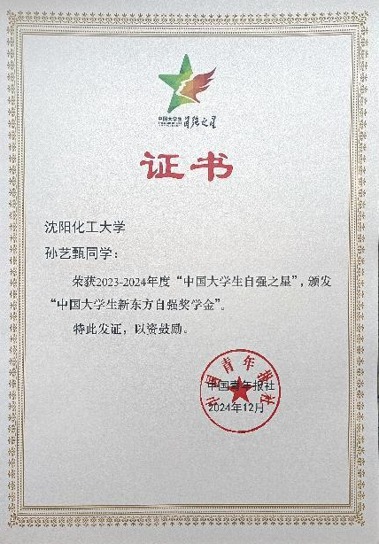 近日,从共青团中央、全国学联传来喜讯,由团中央基层建设部、中国青年报社、新东方教育科技集团、中国青年创业就业基金会联合举办的2023 - 2024年度“中国大学生自强之星”奖学金评选结果揭晓,bat365中文官方网站孙艺甄同学凭借出色的个人表现和突出的自强事迹,荣获“中国大学生自强之星”荣誉称号。